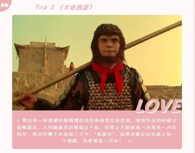 《大话西游》——星爷的经典之作,当中无数台词至今仍不断不断被大家反复引用传颂。这本是一部喜剧片,却在不经意间用爱情打动了众人,尤其是这个结尾,这个女主也猜不到的结尾。感人至深。每每到这个桥段,我都忍不住陪那猴子一起,落一滴泪。