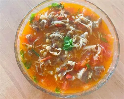 下少许油,烧热,下姜片、葱段煸炒出香(因为最后会放牛肉,这里的葱姜除了增香还有去腥的作用),下金针菇炒软变色,捞出姜片、葱、金针菇;下番茄块炒出汁,料酒、少许生抽、黑胡椒盐、糖,翻炒均匀后加热水,加入之前捞出的姜片、葱段、金针菇,加盖中火煮一会儿,煮到汤底融合成浓郁的番茄浓汤即可。