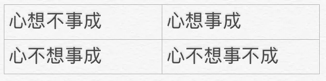 4、检验什么是“心想事成”,从否定的角度出发,如果不心想这件事就不成,这件事就是心想事成。