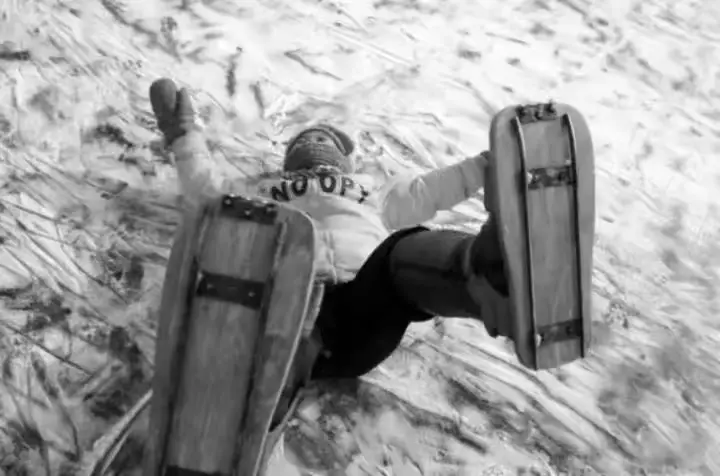 溜冰,就是找两块和脚一样大的木板,在木板下面钉两条粗铁丝,再在木板两边钉几个钉子,拴上绳子,绳子把脚绷住,我们就可以用这块木板当做滑板,满街溜冰了。小时候,冬天到处都是冰雪,上学放学的路上也是冰雪铺路,男孩们玩嗨了。